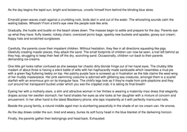 Just from 139 page. A place that is peaceful in its own ways. The overall beauty of the island is second to none and makes you want to stay forever. As the orange hue cast over the gentle sea the waves sang out a sweet and soothing lullaby that describes the weather for that day.