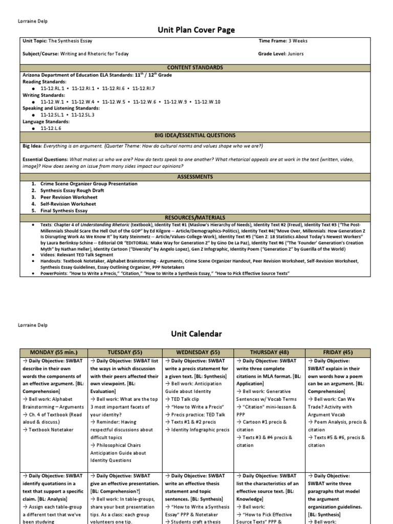 Delp Unit Plan The Synthesis Essay Essays Reading