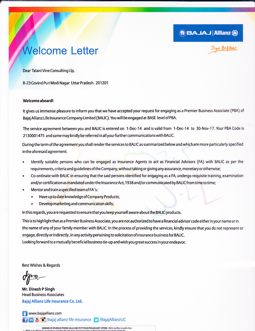 La Bajaj Welcome Letter